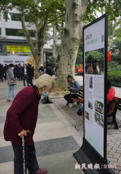 上午,许多市民在静安公园参天悬铃木古树群中,饶有兴致地观看展览。展示分室外和室内两个展区。室外展区位于静安公园悬铃木大道处,展示了全市16个区在古树名木保护方面的工作和成效。室内展区位于静安公园展示场馆内,通过文字、图片和视频等形式,全面展示上海古树名木的风貌、古树名木保护历程和成效。