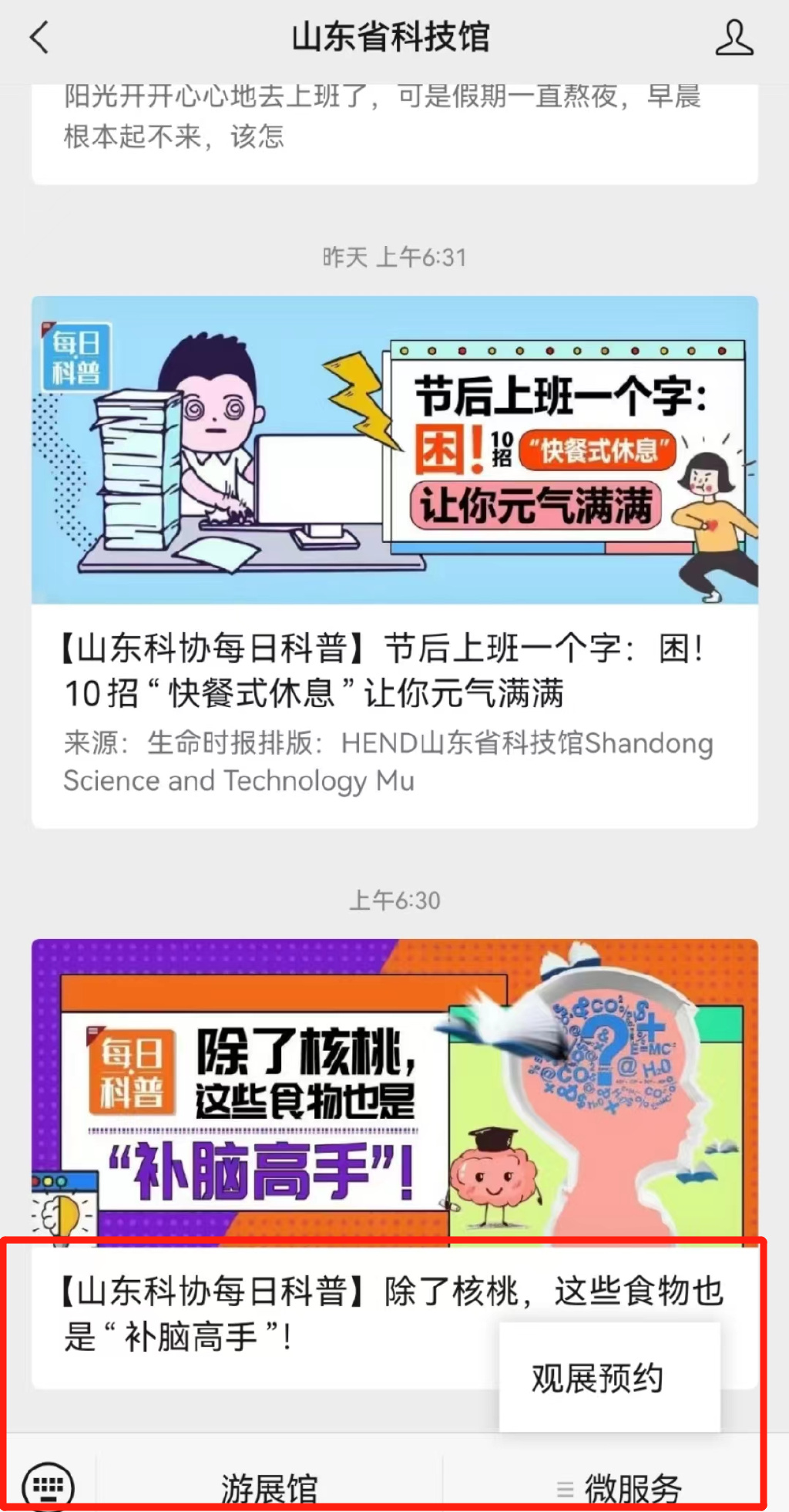 第一步:关注微信公众号【山东省科技馆】,点击“微服务"——"观展预约";